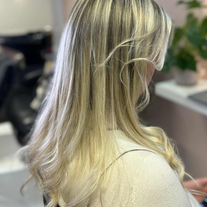 Monivärivärjäys ja leikkaus, hiukset lapaluiden alapuolella. Sisältää pesun.