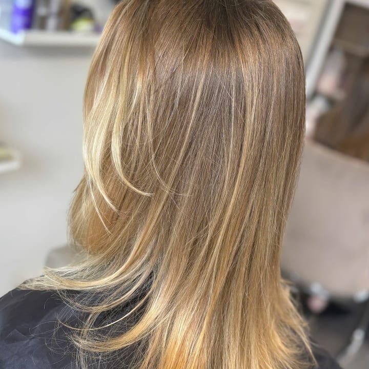 Monivärivärjäys ja leikkaus, hiukset lapaluiden alapuolella. Sisältää pesun.
